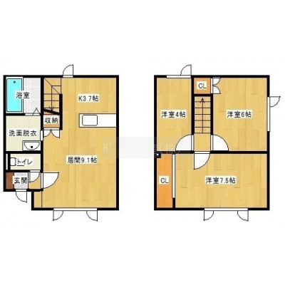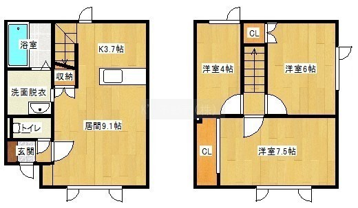 3LDK(68m²)└ 1階:LDK12.8帖 / 2階:洋室7.5帖 洋室6帖 洋室4帖