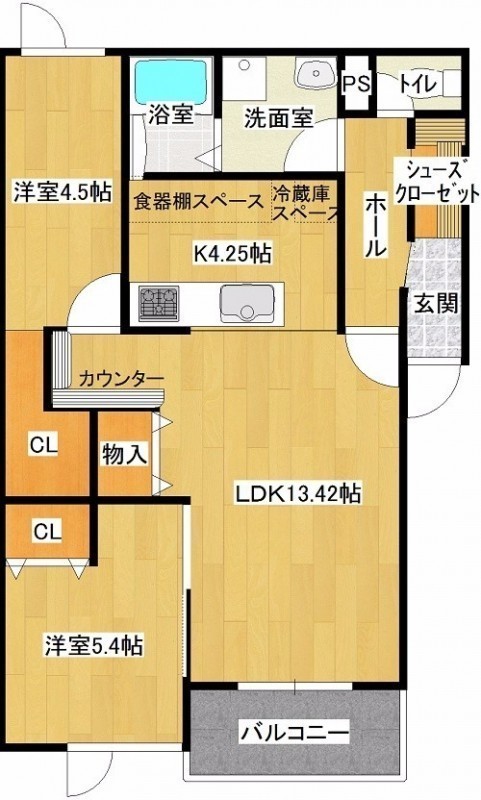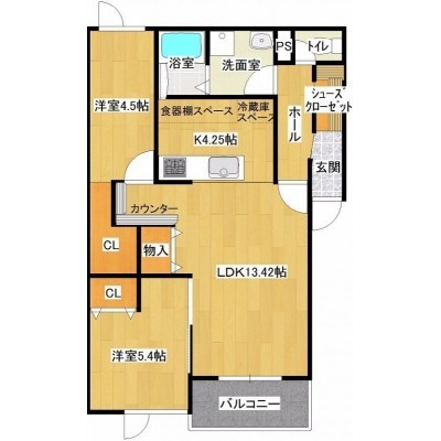 2LDK(66.04m²)└ LDK13.42帖 洋室5.4帖 洋室4.5帖