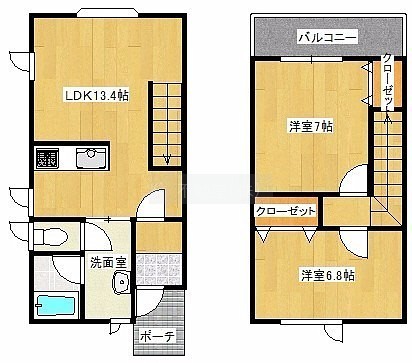 2LDK└ 1階:LDK13.4帖 / 2階:洋室7帖 洋室6.8帖
