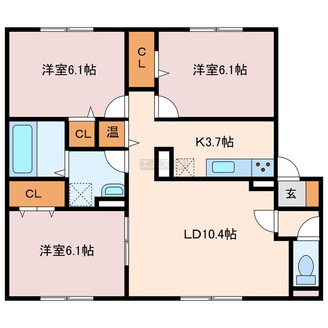 3LDK(73m²)└ LD10.4帖 K3.7帖 洋室6.1帖 洋室6.1帖 洋室6.1帖