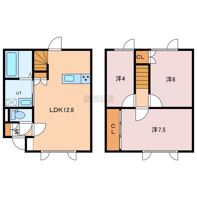 3LDK└ 1階:LDK12.8帖 / 2階:洋室7.5帖 洋室6帖 洋室4帖