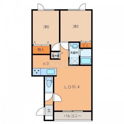 2LDK(56.34m²)└ LD10.4帖 K3帖 洋室6帖 洋室6帖