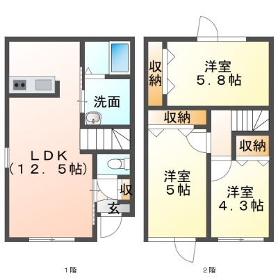 3LDK(67.4m²)└ 1階:LDK12.5帖 / 2階:洋室5.8帖 洋室5帖 洋室4.3帖