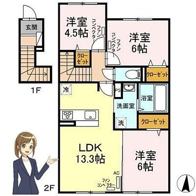 3LDK(71.67m²)└ 2階:LDK13.3帖 洋室6帖 洋室6帖 洋室4.5帖