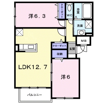 2LDK(55.37m²)└ 2階:LDK12.7帖 洋室6.3帖 洋室6帖