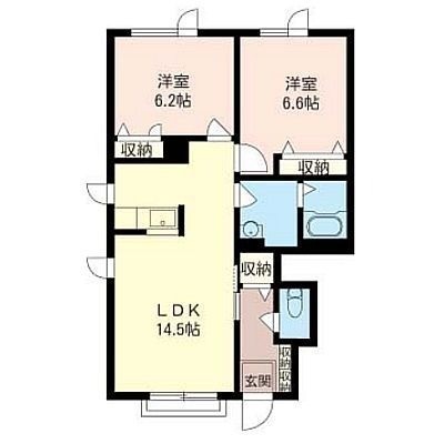 2LDK(59.3m²)└ 2階:LDK14.5帖 洋室6.6帖 洋室6.2帖