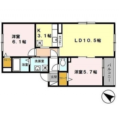 2LDK(56.98m²)└ 1階:LDK13.6帖 洋室6.1帖 洋室5.7帖
