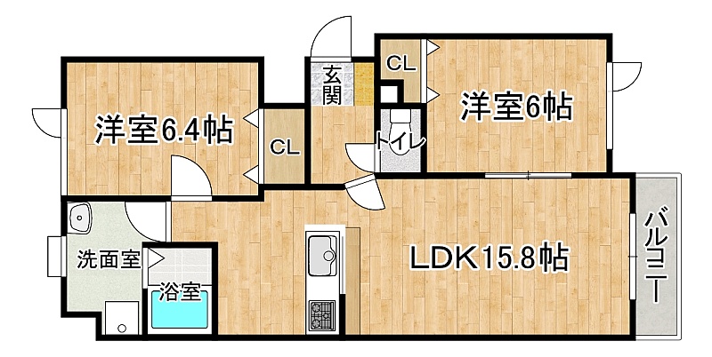 2LDK(62.57m²)└ 2階:LDK15.8帖 洋室6.4帖 洋室6帖