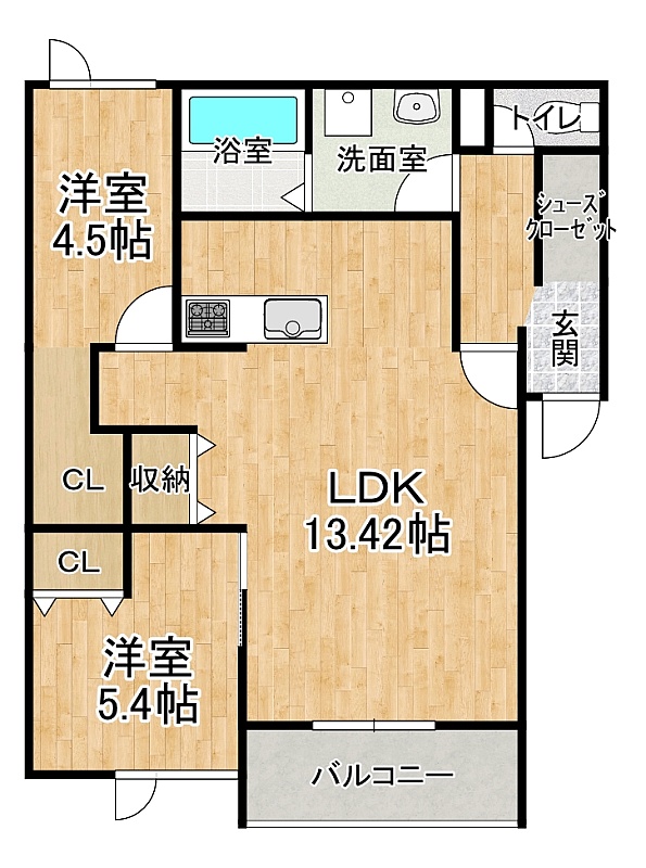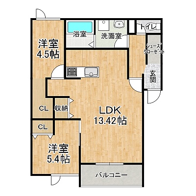 2LDK(66.04m²)└ 2階:LDK13.42帖 洋室5.4帖 洋室4.5帖