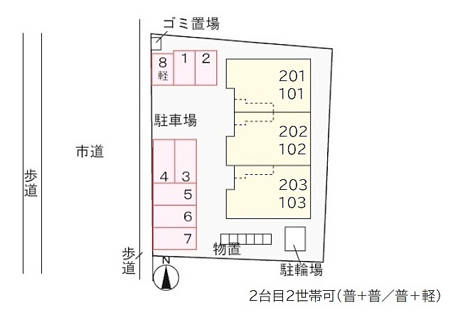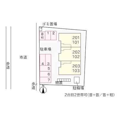 所在階/建物の階建 2階(201) / 地上2階建 総戸数 6戸 主要採光面 構造 木造(2×4) 契約期間 2年間 住宅保険 1万8,000円(2年間) その他費用 毎月の費用 - 保証料:1,373円