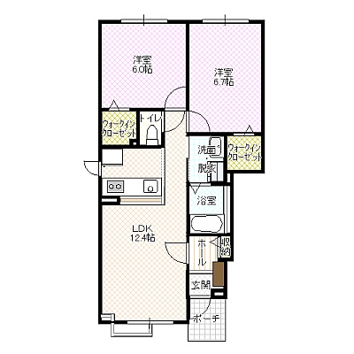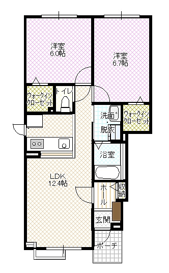 2LDK(55.93m²)└ LD12.4帖 K 洋室6.7帖 洋室6帖