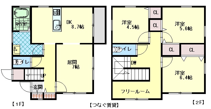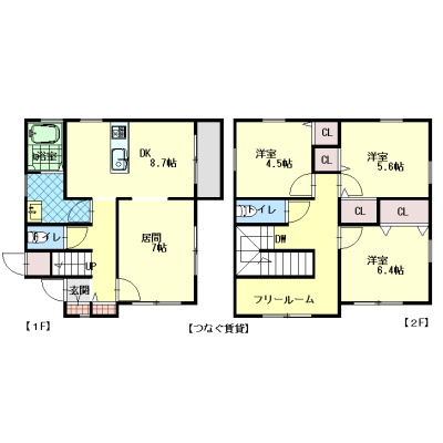 3LDK(98.43m²)└ 1階:L8帖 DK8.7帖 / 2階:洋室6.4帖 洋室5.6帖 洋室4.5帖 その他4帖