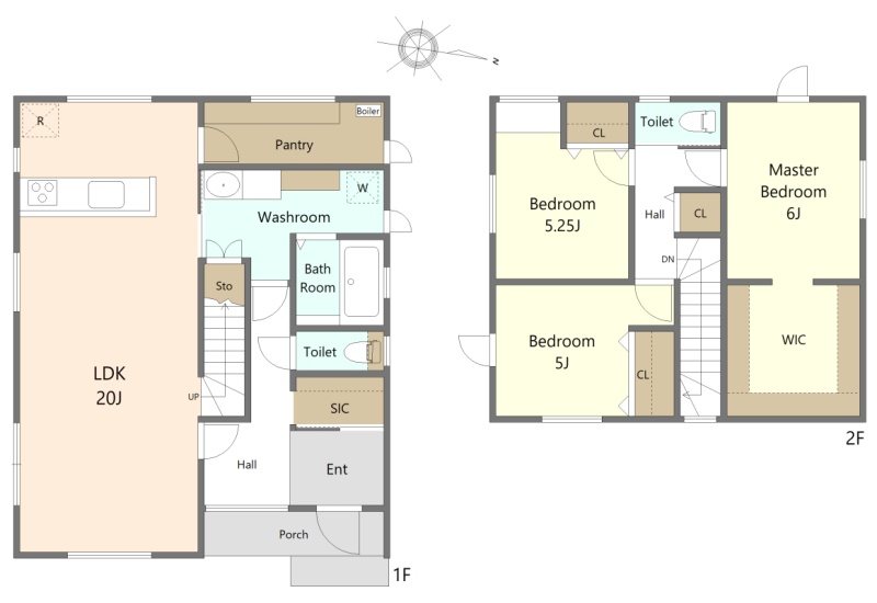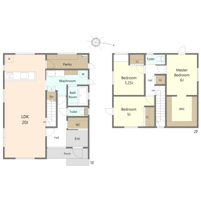 3LDK(109.3m²)└ 1階:LDK20帖 S3帖 / 2階:洋室6帖 洋室5.25帖 洋室5帖