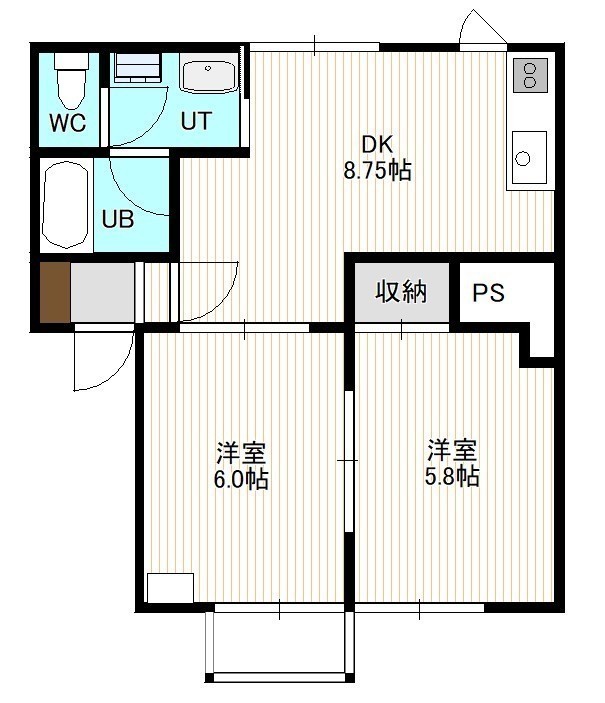 2DK(46.02m²)└ 1階:DK8.7帖 洋室6帖 洋室5.8帖