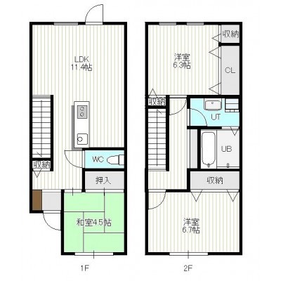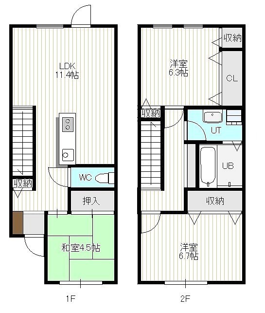 3LDK(79.2m²)└ 1階:LDK11.4帖 和室4.5帖 / 2階:洋室6.7帖 洋室6.3帖