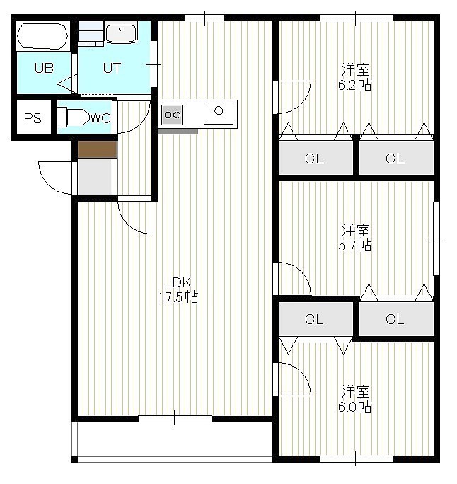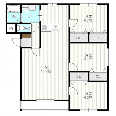 3LDK(80.4m²)└ 3階:LDK17.5帖 洋室6.2帖 洋室6帖 洋室5.7帖