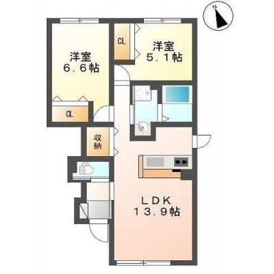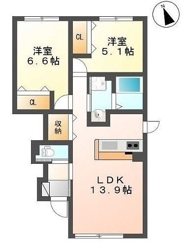 2LDK(57.16m²)└ 1階:LDK13.9帖 洋室6.6帖 洋室5.1帖