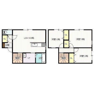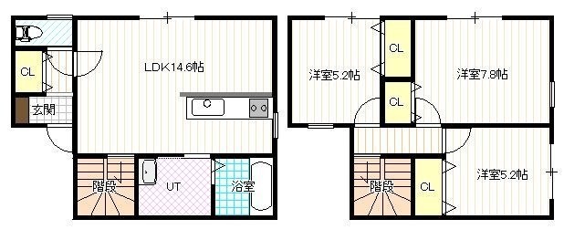 3LDK(81.38m²)└ 1階:LDK14.6帖 / 2階:洋室7.8帖 洋室5.2帖 洋室5.2帖