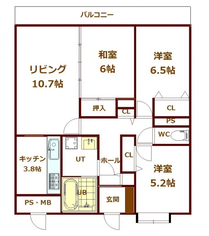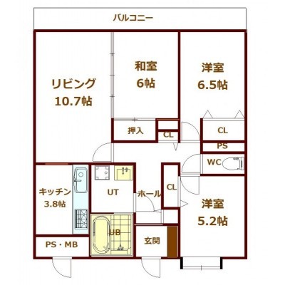 3LDK(61.92m²)└ 1階:LD10.7帖 洋室6.5帖 洋室5.2帖 和室6帖 K3.8帖