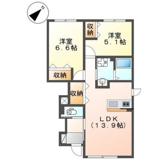 2LDK(57.16m²)└ LDK13.9/洋室6.6/洋室5.1