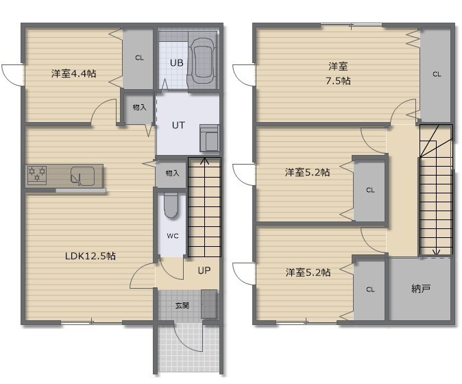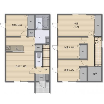 4LDK(89.42m²)└ 2階:洋室5.2帖 洋室5.2帖 / その他:LDK12.5帖 洋室4.4帖 洋室7.5帖