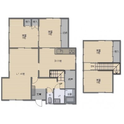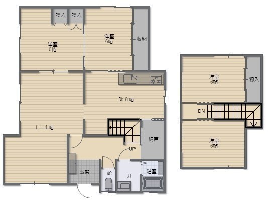4LDK(103.68m²)└ 1階:L14帖 DK8帖 洋室6帖 洋室6帖 / 2階:洋室6帖 洋室6帖