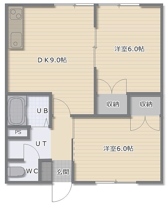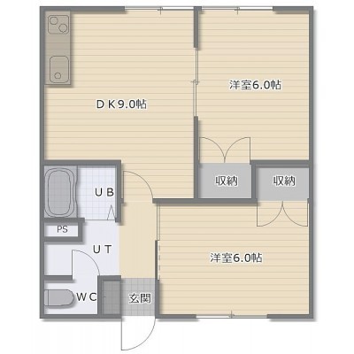 2DK(46.28m²)└ DK9帖 洋室6帖 洋室6帖