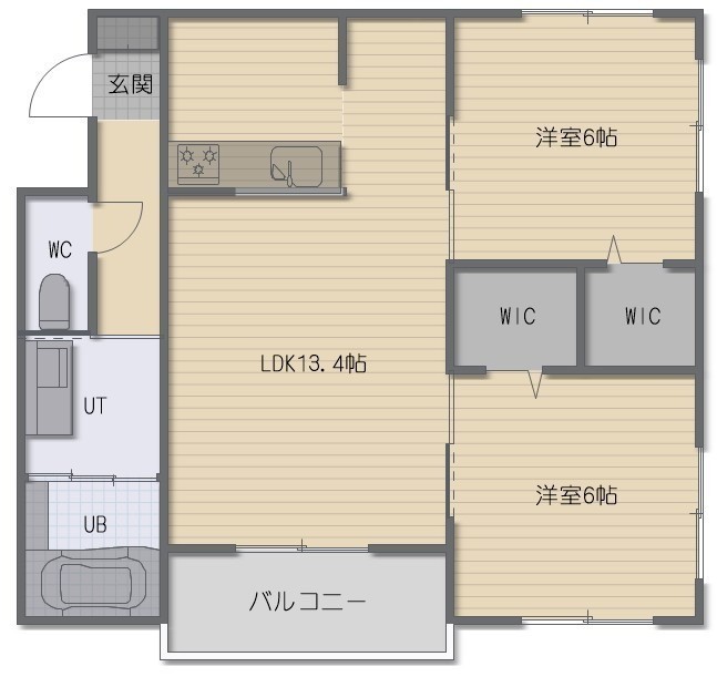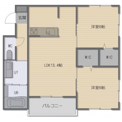 2LDK(61.2m²)└ LDK13.4帖 洋室6帖 洋室6帖