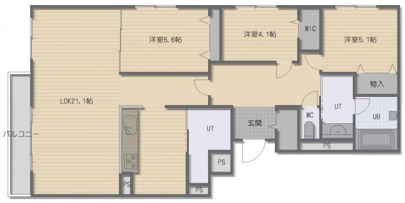 3LDK(108.91m²)└ LDK21.1帖 洋室6.6帖 洋室5.1帖 洋室4.1帖