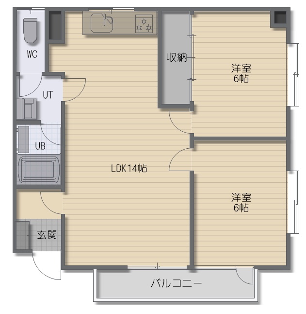 2LDK(54.6m²)└ LDK14帖 洋室6帖 洋室6帖
