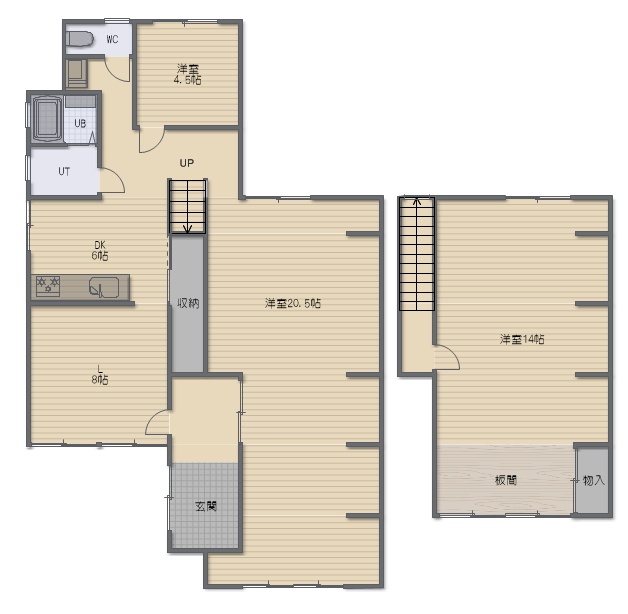 3LDK(143.67m²)└ 1階:L8帖 DK6帖 洋室4.5帖 洋室20.5帖 / 2階:洋室14帖