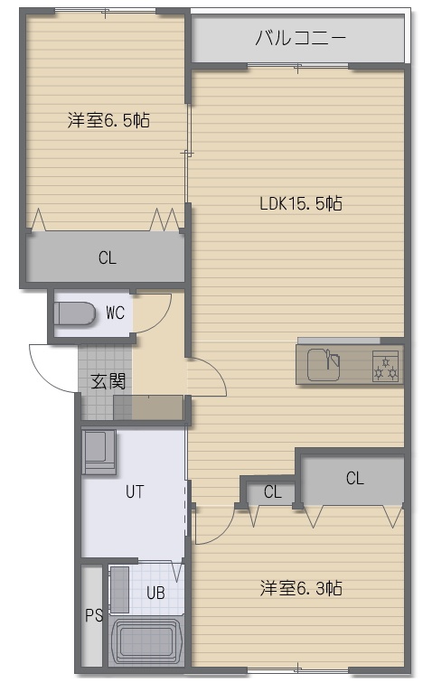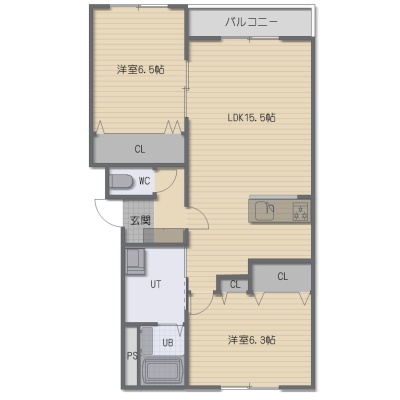 2LDK(61.71m²)└ LDK15.5帖 洋室6.5帖 洋室6.3帖