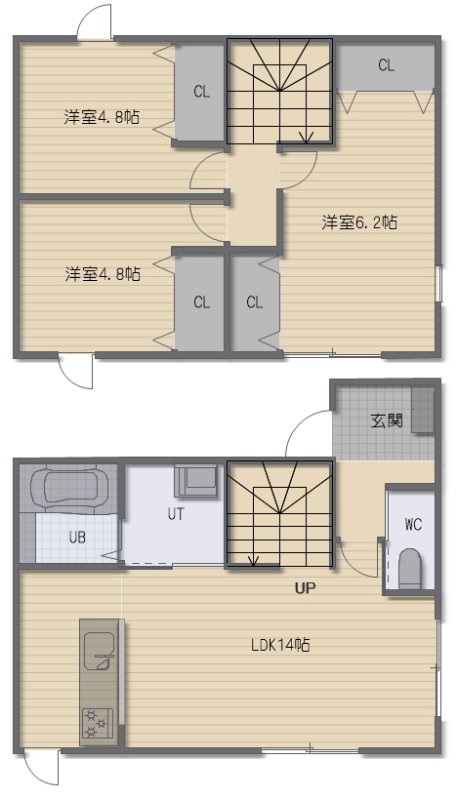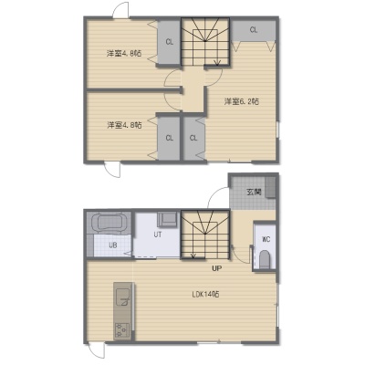 3LDK(75.35m²)└ 1階:LDK14帖 / 2階:洋室6.2帖 洋室4.8帖 洋室4.8帖