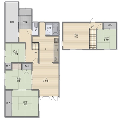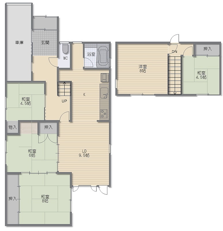 5LDK(100.33m²)└ 1階:LD9.5帖 K6.5帖 和室8帖 和室6帖 和室4.5帖 / 2階:洋室8帖 和室4.5帖