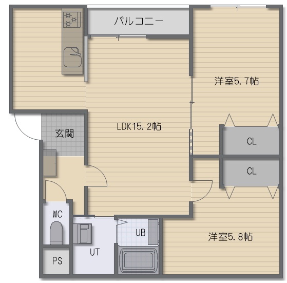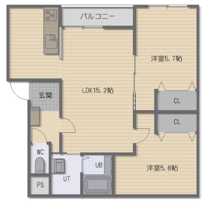 2LDK(59.22m²)└ LDK15.2帖 洋室5.8帖 洋室5.7帖