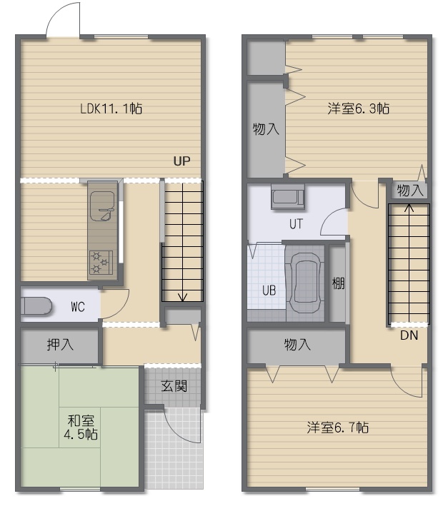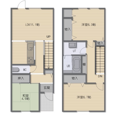 3LDK(85.02m²)└ 1階:LDK11.1帖 和室4.5帖 / その他:洋室6.7帖 洋室6.3帖