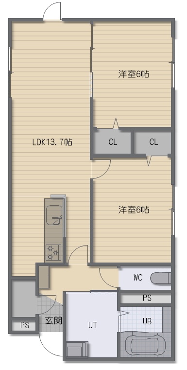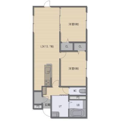 2LDK(58.74m²)└ LDK13.7帖 洋室6帖 洋室6帖