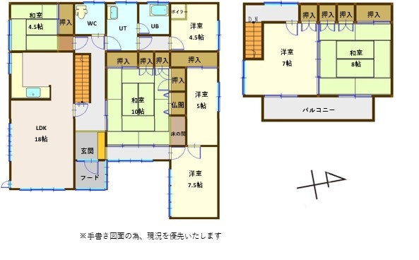 5SLDK└ 1階:LDK18帖 和室4.5帖 和室10帖 洋室7.5帖 / 2階:洋室7帖 和室8帖