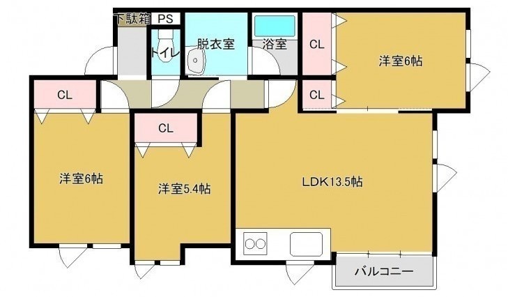 3LDK(71.55m²)└ LDK13.5帖 洋室6帖 洋室6帖 洋室5.4帖