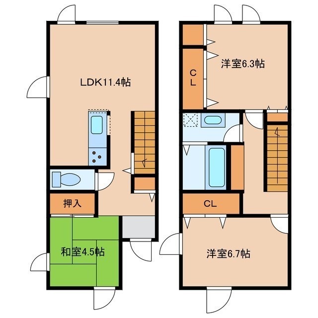 3LDK(79.2m²)└ 1階:LDK11.1帖 和室4.5帖 / 2階:洋室6.7帖 洋室6.3帖