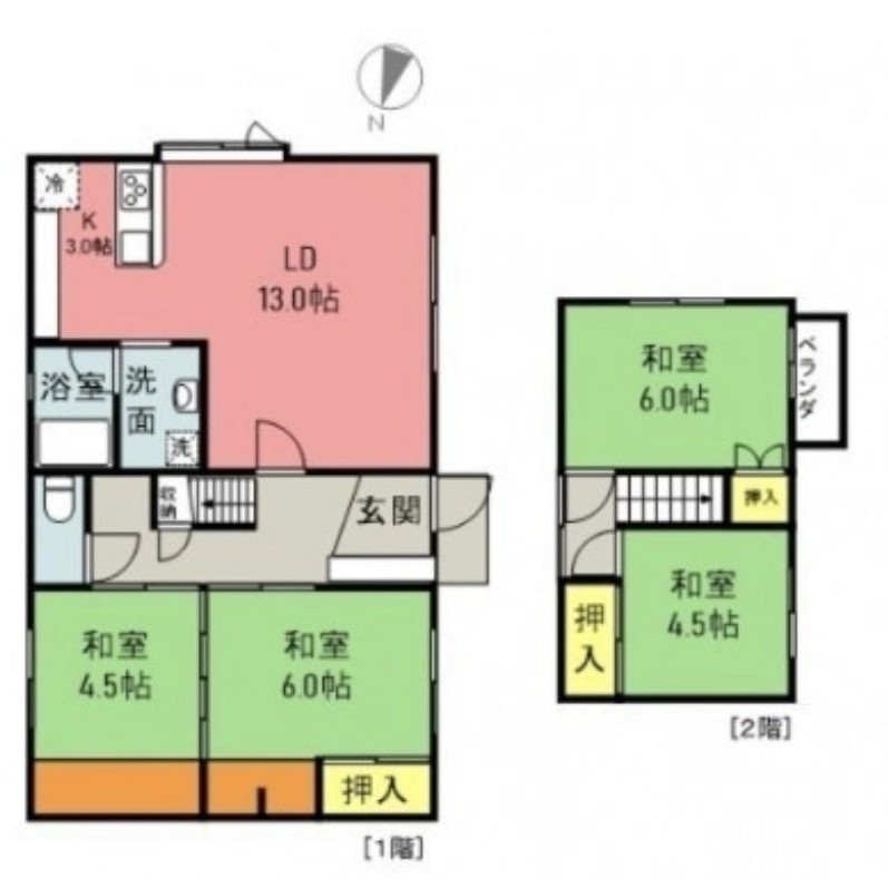 4LDK(93.28m²)└ 1階:LD13帖 K3帖 和室4.5帖 和室6帖 / 2階:和室6帖 和室4.5帖