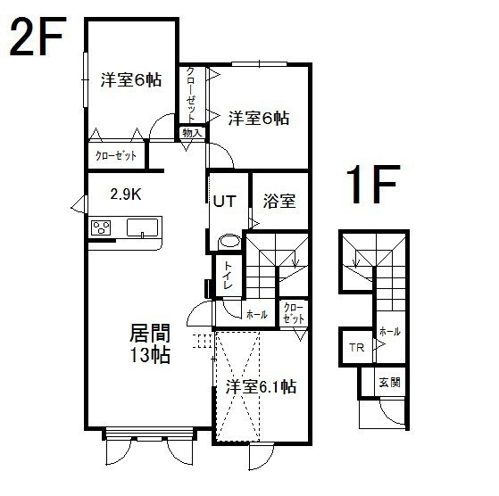 3LDK(86.46m²)└ 2階:LD13帖 K2.9帖 洋室6.1帖 洋室6帖 洋室6帖