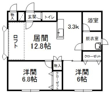 2LDK(61.56m²)└ 2階:LD12.8帖 K3.3帖 洋室6.8帖 洋室6帖