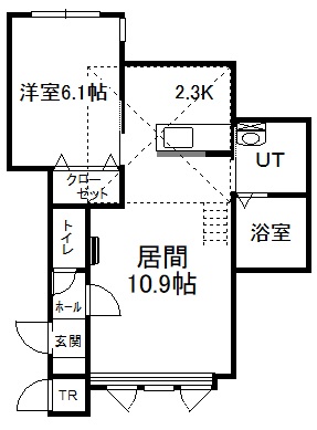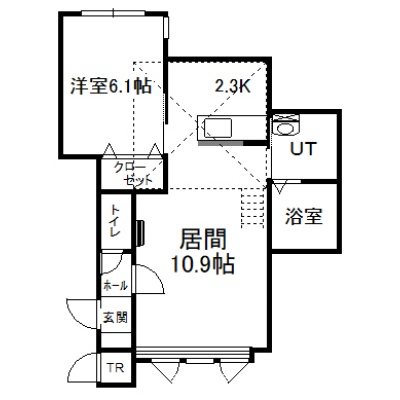 1LDK(46.74m²)└ 2階:LD10.9帖 K2.3帖 洋室6.1帖