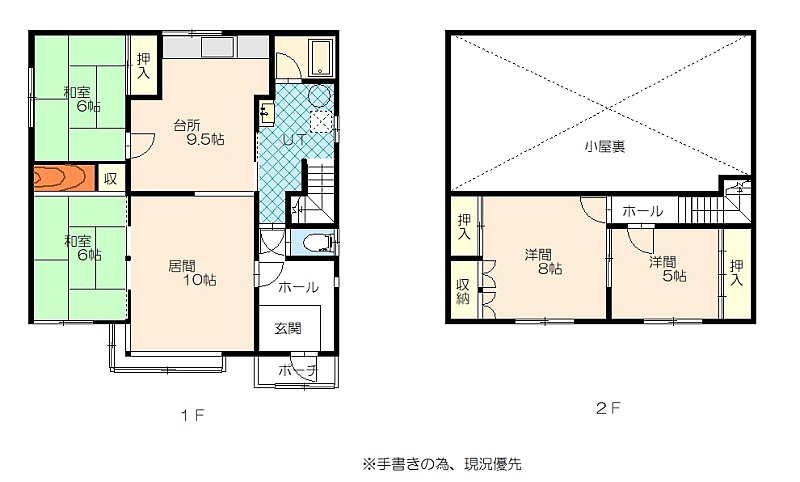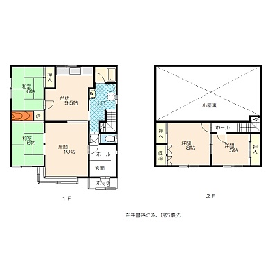 4LDK(106.11m²)└ 1階:LD10帖 K9.5帖 和室6帖 和室6帖 / 2階:洋室8帖 洋室5帖