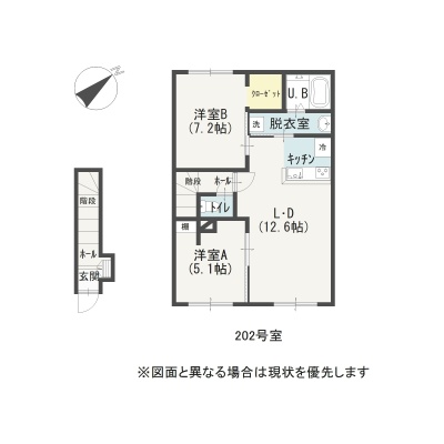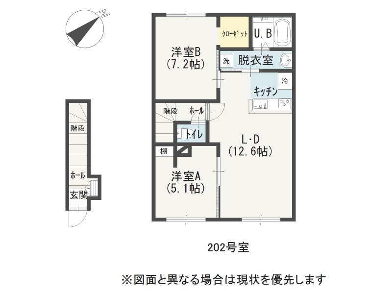 2LDK(54.13m²)└ 2階:LDK12.6帖 洋室7.2帖 洋室5.1帖