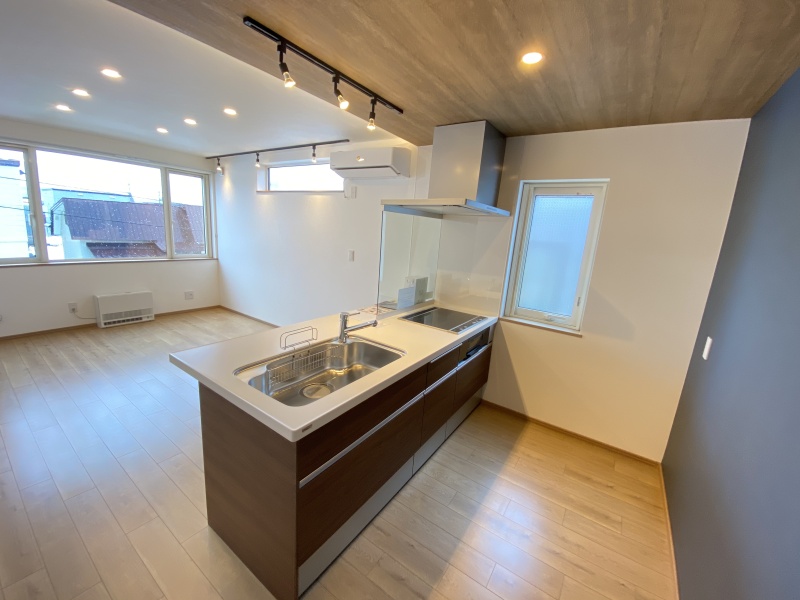 ここに注目!神楽岡のデザイナーズAP キッチンはペニンシュランキッチンで夜はバーカウンタ-風に使用できます(^^♪ 浴室も一坪タイプ追炊き付きでペット可物件です ★旭川医科大学病院迄2.6km