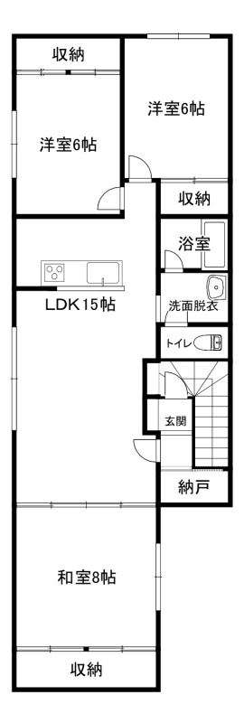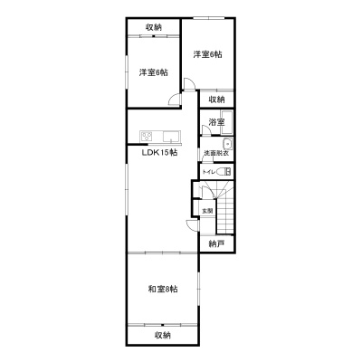 3LDK(79.38m²)└ 2階:LDK15帖 和室8帖 洋室6帖 洋室6帖