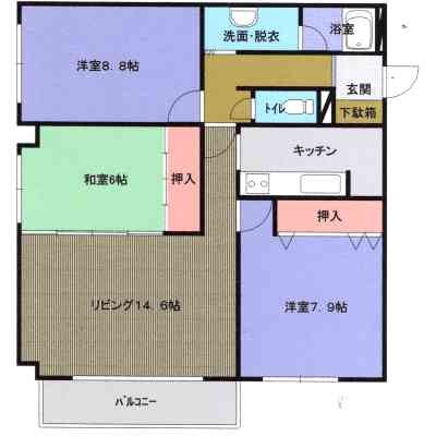 3LDK(90m²)└ 居14.6/洋8.8/洋7.9/和6/K4.9