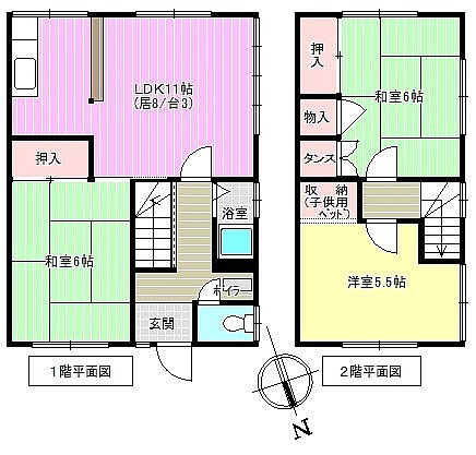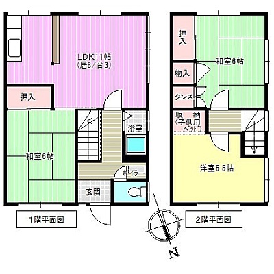 3LDK(66.23m²)└ 1階:LDK11帖 和室6帖 / 2階:和室6帖 洋室5.5帖